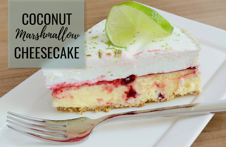 Deze coconut marshmallow cheesecake van Erseline Principaal bestaat uit 3 lagen: Een bodem van gebroken koekjes, daarboven een laag cheesecake met kokossmaak en bovenop ligt een dikke laag zelfgemaakte marshmallow. De lagen worden samengehouden met een dun laagje frisse kersenjam.